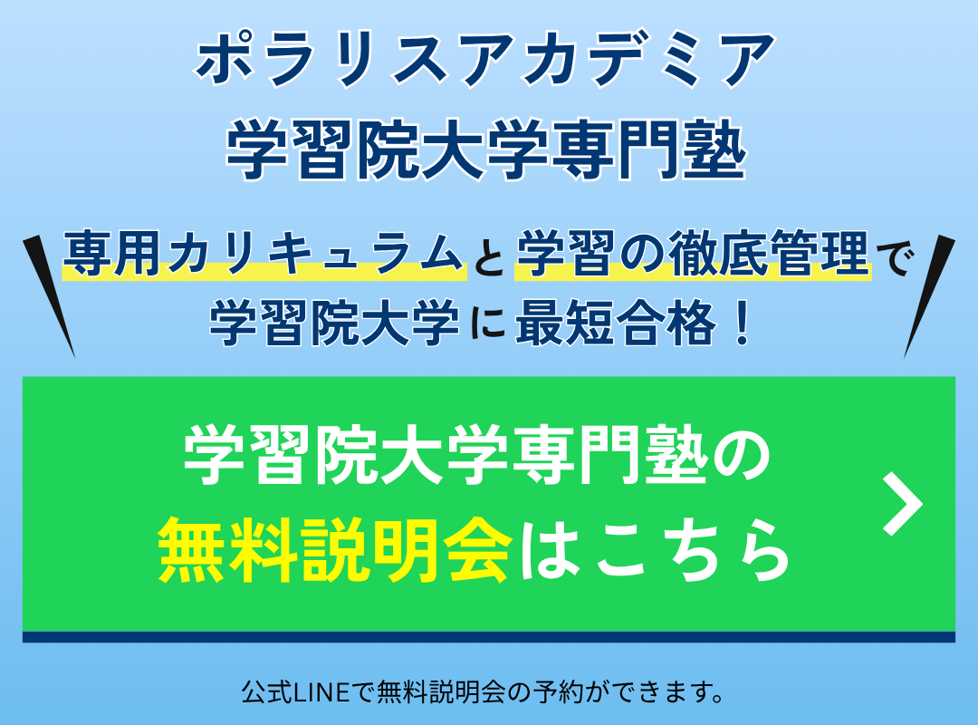 本気で学習院大学大学に合格したい方、合格させたい親御さんはこの機会に公式LINEから無料入塾説明会に申し込んで、学習院大学大学合格へ一歩近づきましょう!