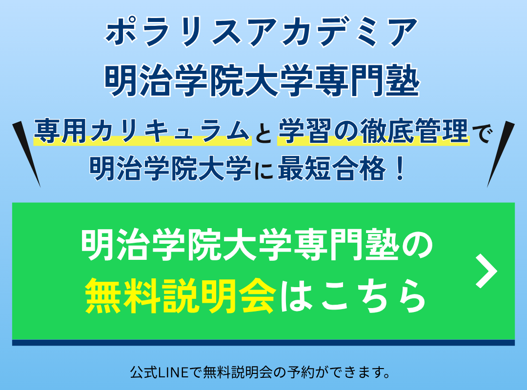 本気で明治学院大学に合格したい方、合格させたい親御さんはこの機会に公式LINEから無料入塾説明会に申し込んで、明治学院大学合格へ一歩近づきましょう!