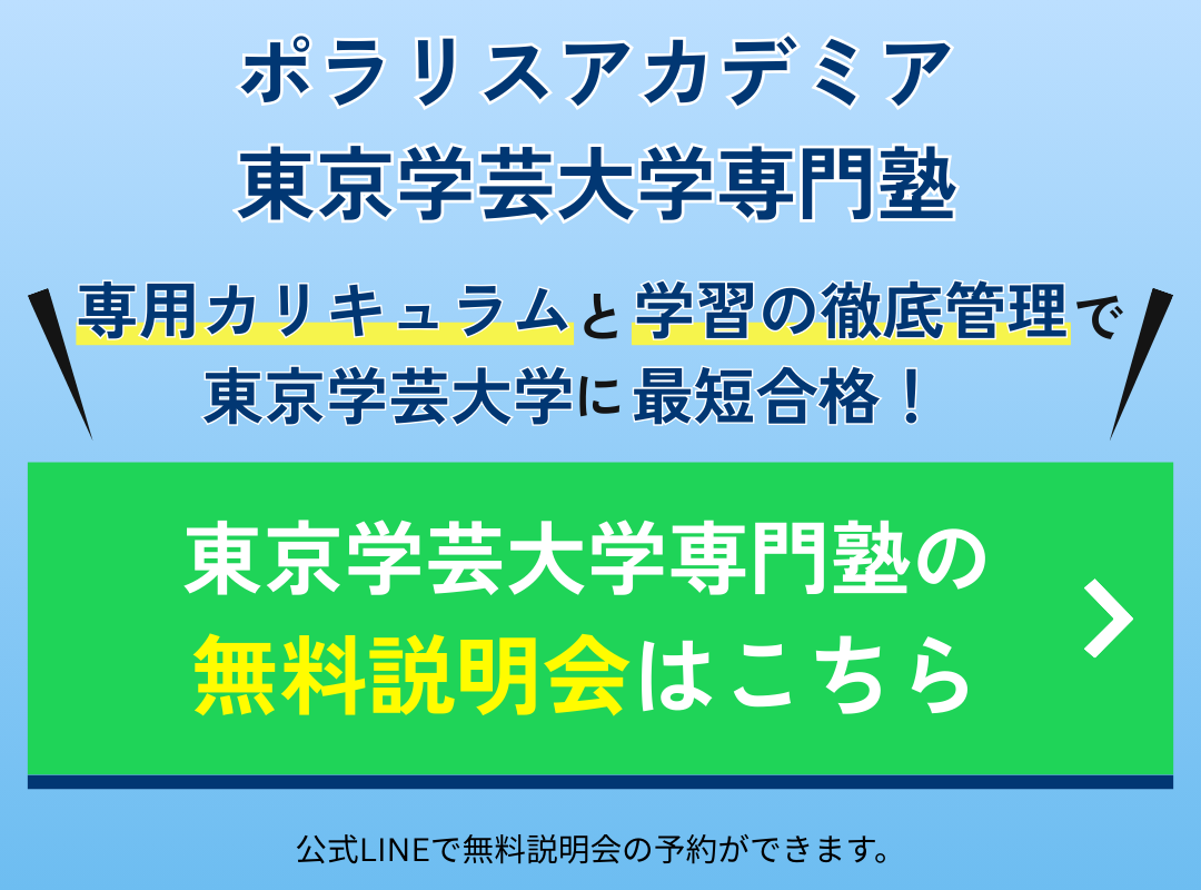 本気で東京学芸大学に合格したい方、合格させたい親御さんはこの機会に公式LINEから無料入塾説明会に申し込んで、東京学芸大学合格へ一歩近づきましょう!