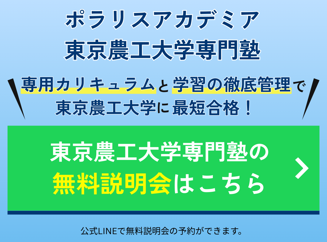 本気で東京農工大学に合格したい方、合格させたい親御さんはこの機会に公式LINEから無料入塾説明会に申し込んで、東京農工大学合格へ一歩近づきましょう!