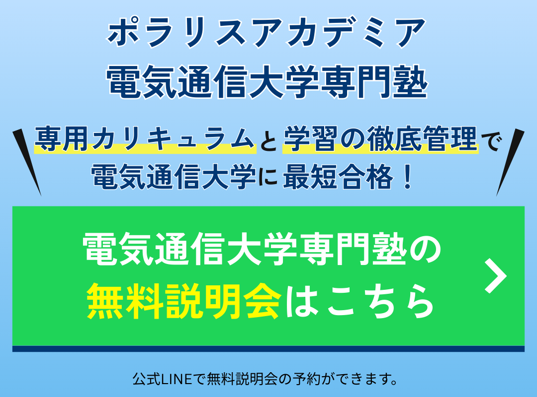 本気で電気通信大学に合格したい方、合格させたい親御さんはこの機会に公式LINEから無料入塾説明会に申し込んで、電気通信大学合格へ一歩近づきましょう!