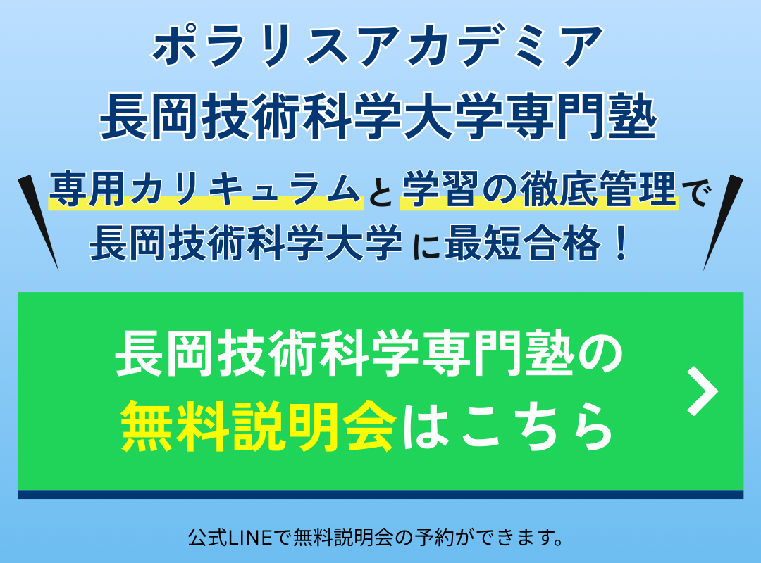 本気で長岡技術科学大学に合格したい方、合格させたい親御さんはこの機会に公式LINEから無料入塾説明会に申し込んで、長岡技術科学大学合格へ一歩近づきましょう!