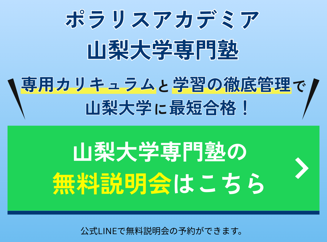 本気で山梨大学に合格したい方、合格させたい親御さんはこの機会に公式LINEから無料入塾説明会に申し込んで、山梨大学合格へ一歩近づきましょう!