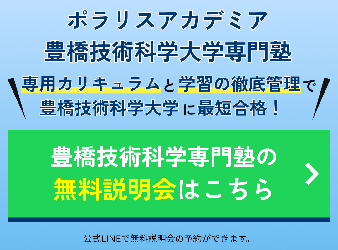 本気で豊橋技術科学大学に合格したい方、合格させたい親御さんはこの機会に公式LINEから無料入塾説明会に申し込んで、豊橋技術科学大学合格へ一歩近づきましょう!