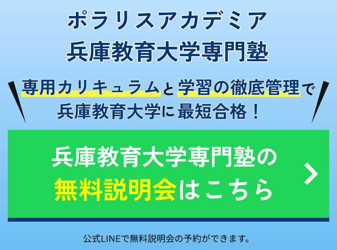 本気で兵庫教育大学に合格したい方、合格させたい親御さんはこの機会に公式LINEから無料入塾説明会に申し込んで、兵庫教育大学合格へ一歩近づきましょう!