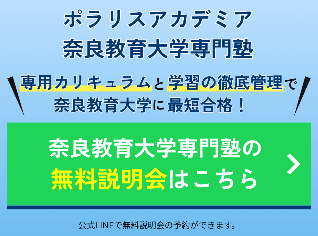 本気で奈良教育大学に合格したい方、合格させたい親御さんはこの機会に公式LINEから無料入塾説明会に申し込んで、奈良教育大学合格へ一歩近づきましょう!