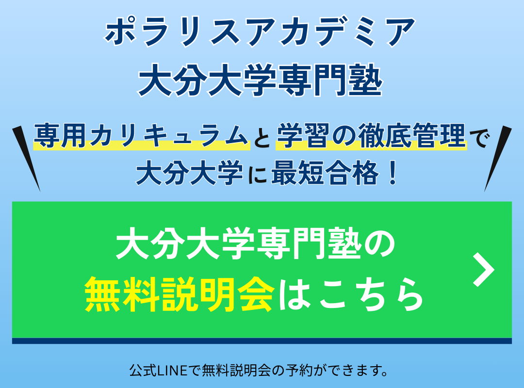 本気で大分大学に合格したい方、合格させたい親御さんはこの機会に公式LINEから無料入塾説明会に申し込んで、大分大学合格へ一歩近づきましょう!
