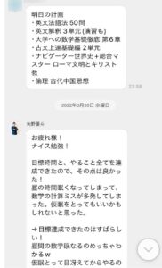 生徒様には学習終了時に振り返りと翌日の計画を提出していただき、それに対しアドバイスを行います。