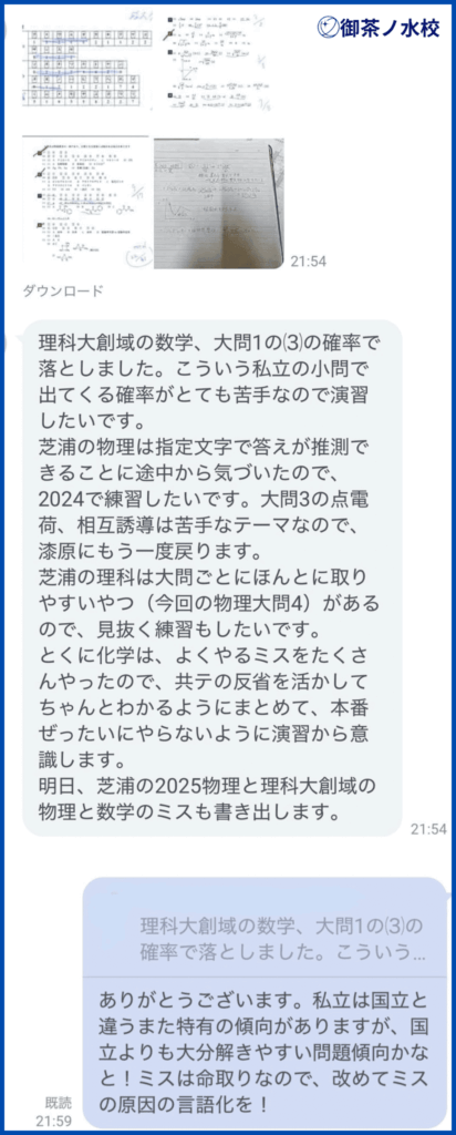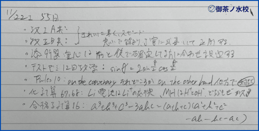 私は、その日の勉強で何をやって何を得たのかをノートへ簡潔に記録したり、模試や過去問の反省を徹底的に分析したりして日報で先生へ提出しつつ、改善に向けたアドバイスをもらっていました!そうした失点の課題から目を背けず、面倒がらずに向き合い続ける姿勢が直接結果につながると実感しました。