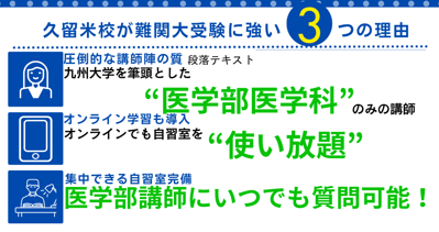 - 全講師が医学部医学科出身、これが久留米校が何よりも誇る特徴です。医学部受験の厳しさや出題傾向、合格までの最短ルートを知り尽くした講師陣が、知識の伝達にとどまらず、「難関大合格に必要な思考力・戦略・学習習慣」までを徹底的に指導します。実際に自ら医学部合格を勝ち取った経験を持つ講師だからこそできる、生きたアドバイスと緻密なサポートで、一人ひとりの弱点を確実に克服。あなたの夢を、最も現実的な方法で実現へと導きます。