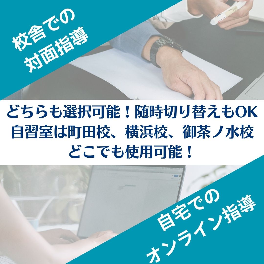 町田校では校舎で対面指導、オンライン指導の両方から選べてどちらも町田校、横浜校、御茶ノ水校の自習室が使用可能です。