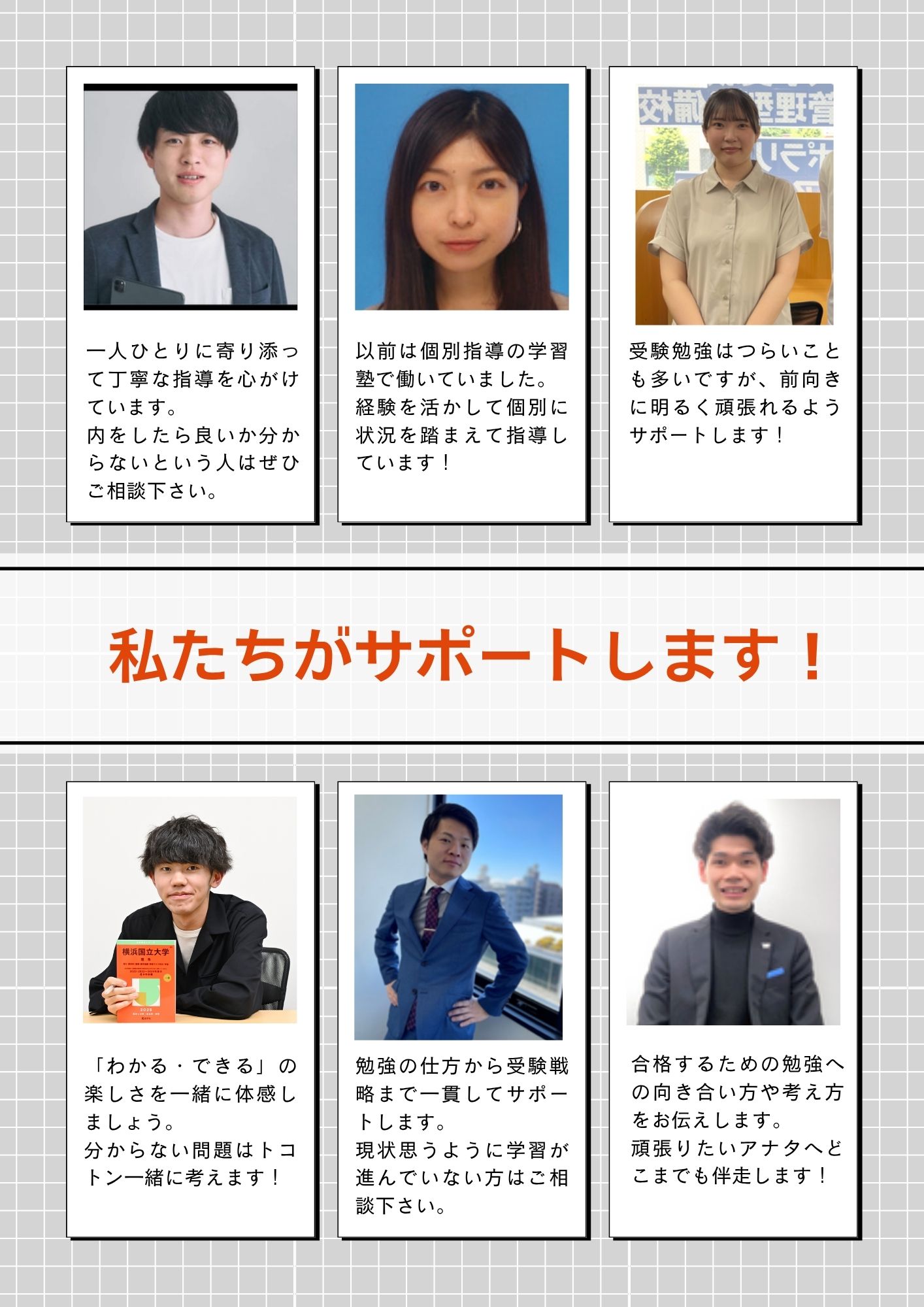 指導する講師は横浜、御茶ノ水校で受験指導を行ってきた社会人・難関大講師が担当するため安心です。