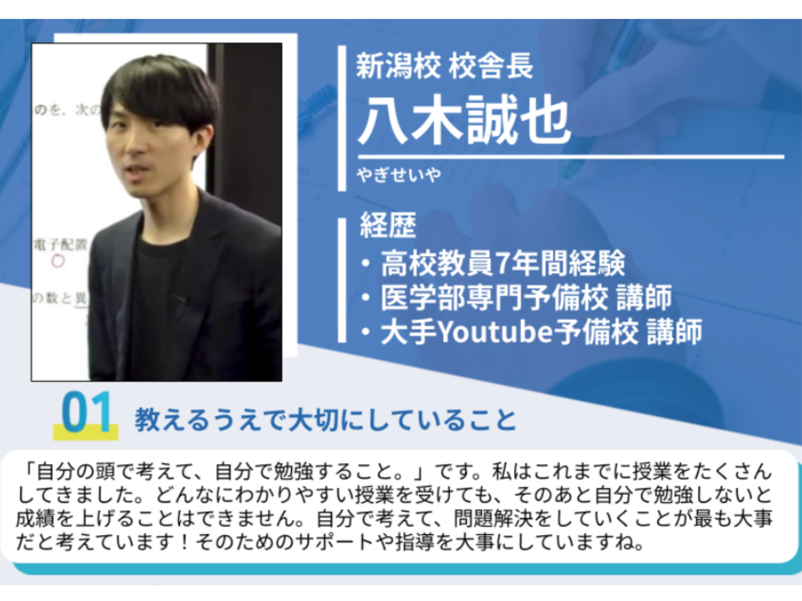 新潟校に在籍する講師は、全員「新潟大学医学部医学科」の方々です。非常に高い学力に加えて、素晴らしい人間性を兼ね備えた講師陣が、皆さんの受験を全力サポートします!みなさんの自習中も常駐してくれるので、質問したい点が出てきたらすぐに解決できます!