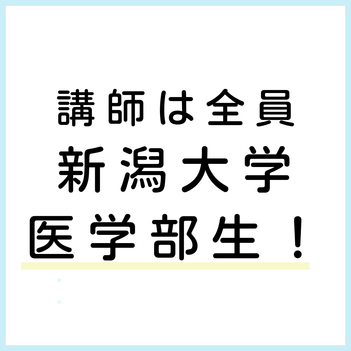 - 新潟校に在籍する講師は、全員「新潟大学医学部医学科」の方々です。非常に高い学力に加えて、素晴らしい人間性を兼ね備えた講師陣が、皆さんの受験を全力サポートします!みなさんの自習中も常駐してくれるので、質問したい点が出てきたらすぐに解決できます!