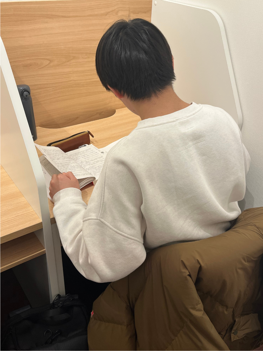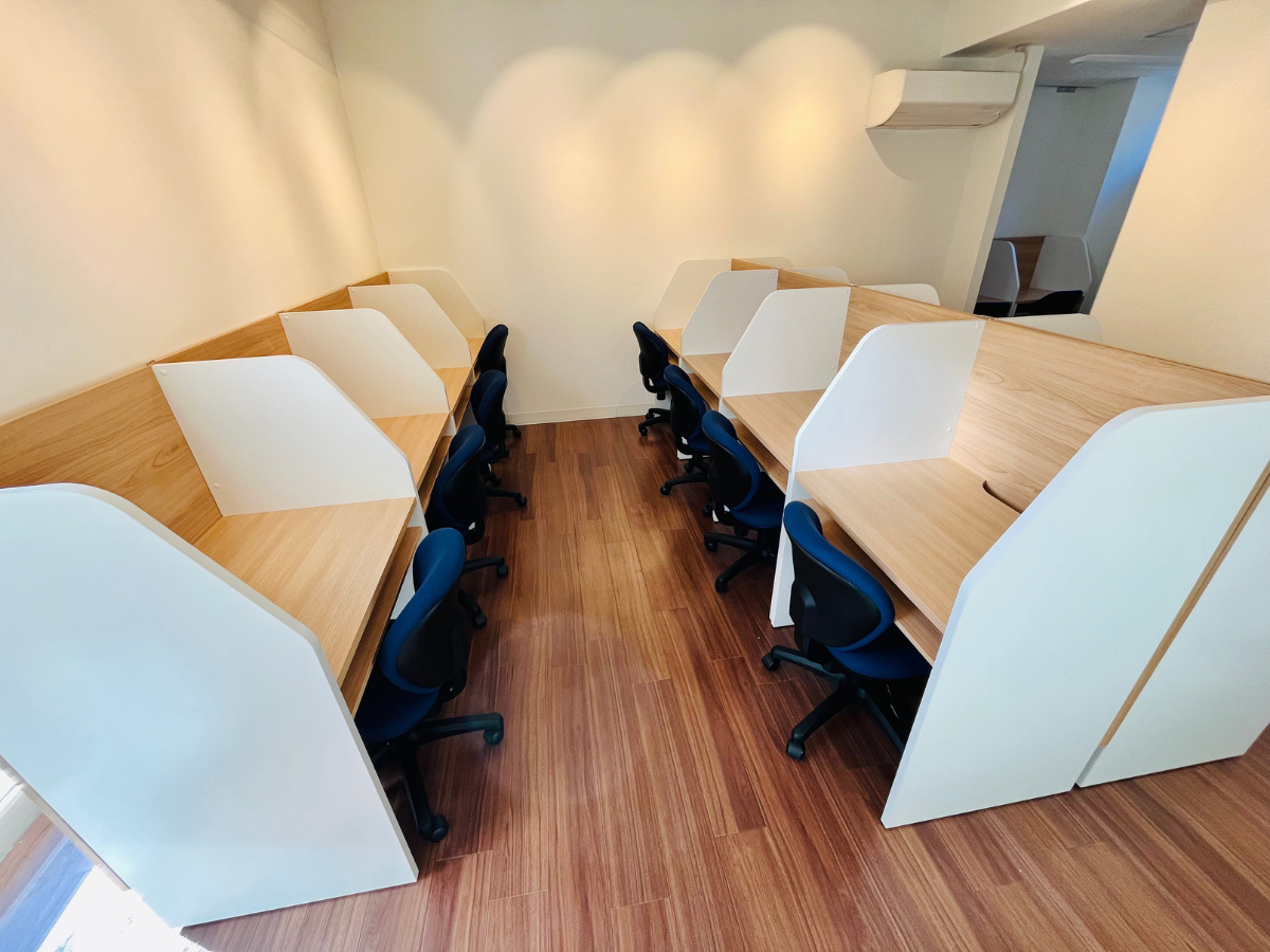 全14席のコンパクトな自習室完備で、使いたい放題です!あえてコンパクトにし、お一人お一人を丁寧に指導できるようにしています。優秀な講師陣も常駐しているため、わからないことがあればすぐに質問可能です!