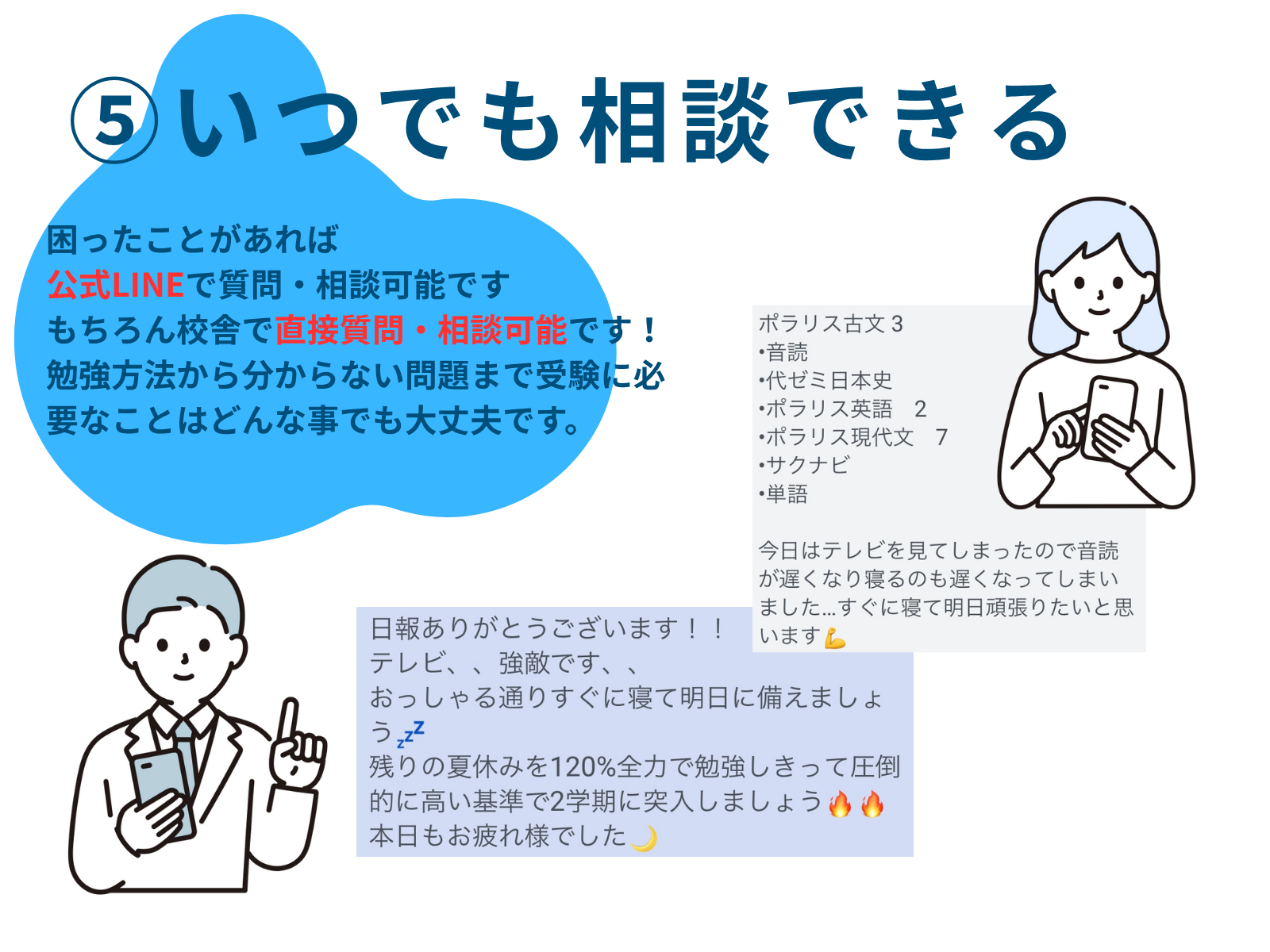 また質問は校舎で対面、公式LINEからのどちらからでもすることができます。